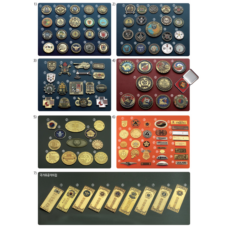 1~4) 코인, 5) 마크,6) 마크&라벨&금속명찰, 7) 국가유공자의집 가격별도문의