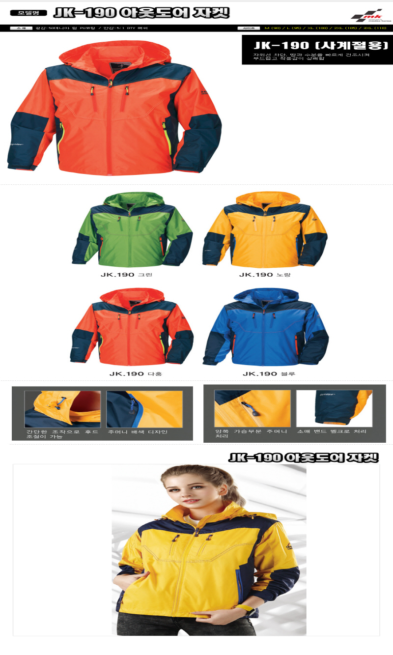 • •Size : M, L, XL, 2XL, 3XL •소재 : 50데니아 립PU코팅/안감:5:1 DTY 매쉬 ※단가변동 있을 수 있습니다. 제품 색상은 인쇄된 것이므로 실제 제품과 다소 차이가 있을 수 있습니다. MC-190