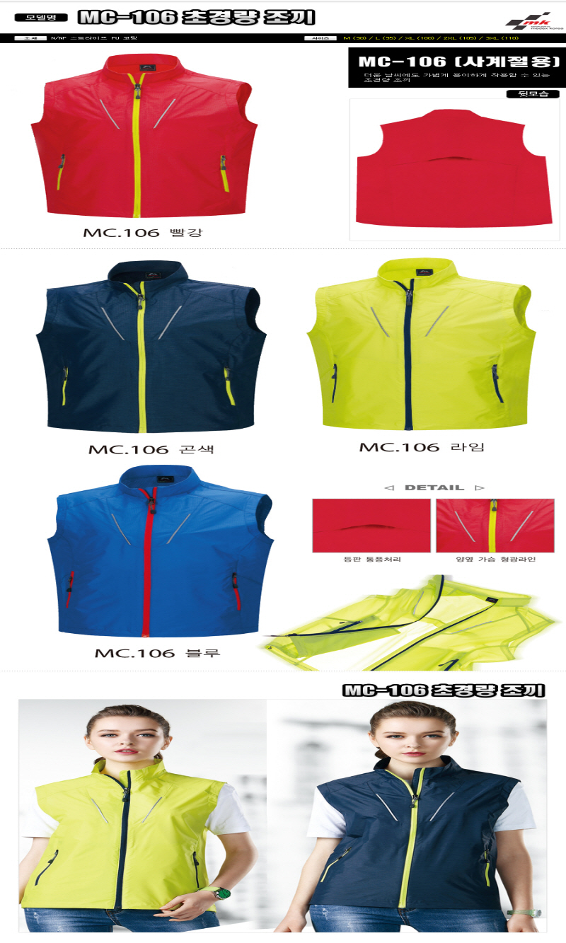 •Size : M, L, XL, 2XL, 3XL •소재 : N/NP 스트라이트 PU코팅 ※단가변동 있을 수 있습니다. 제품 색상은 인쇄된 것이므로 실제 제품과 다소 차이가 있을 수 있습니다. MC-106