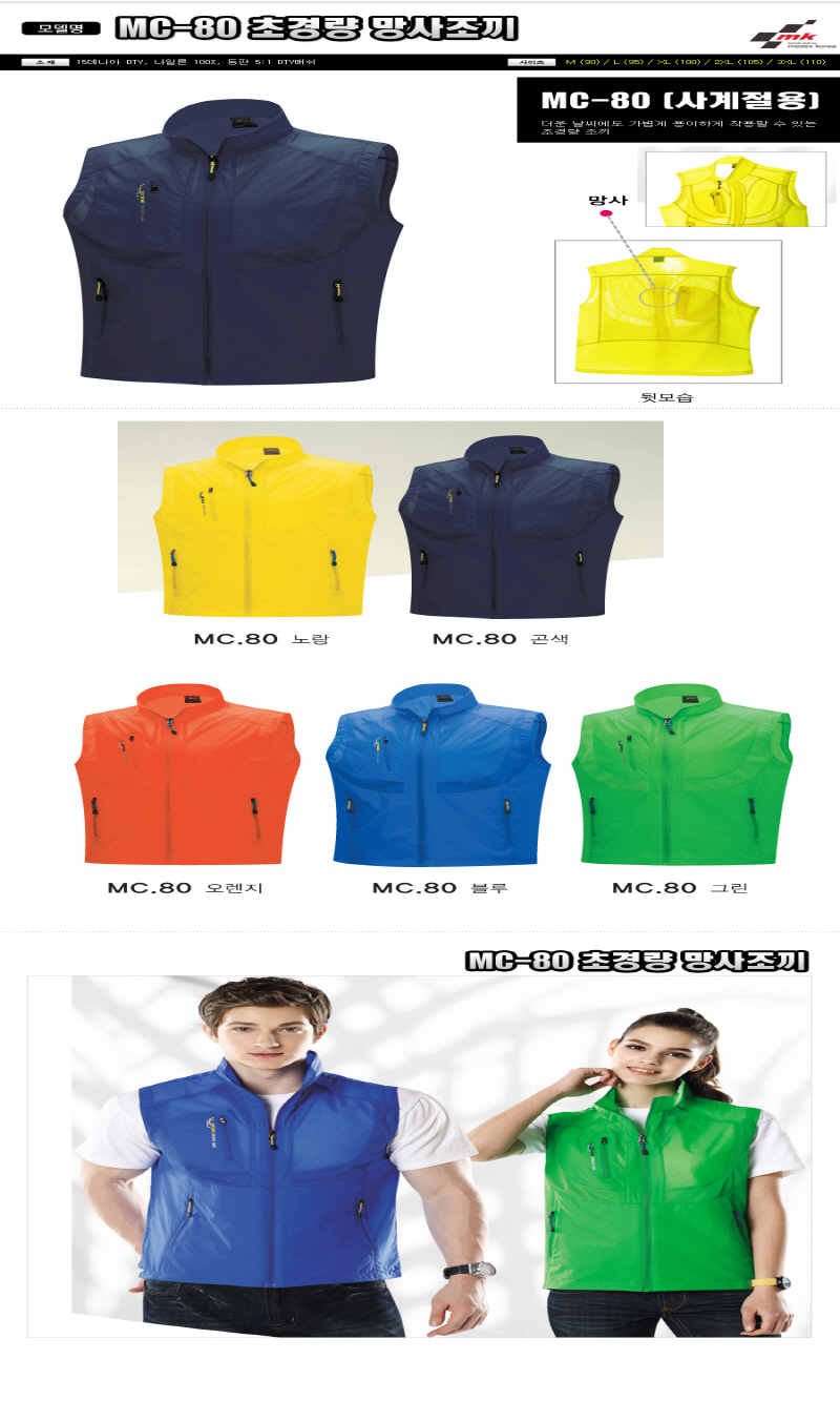 •Size : M, L, XL, 2XL, 3XL •소재 : 15데니아 DTY, 나일론 100%, 등판 5:1 DTY매쉬 ※단가변동 있을 수 있습니다. 제품 색상은 인쇄된 것이므로 실제 제품과 다소 차이가 있을 수 있습니다. ※MC-80