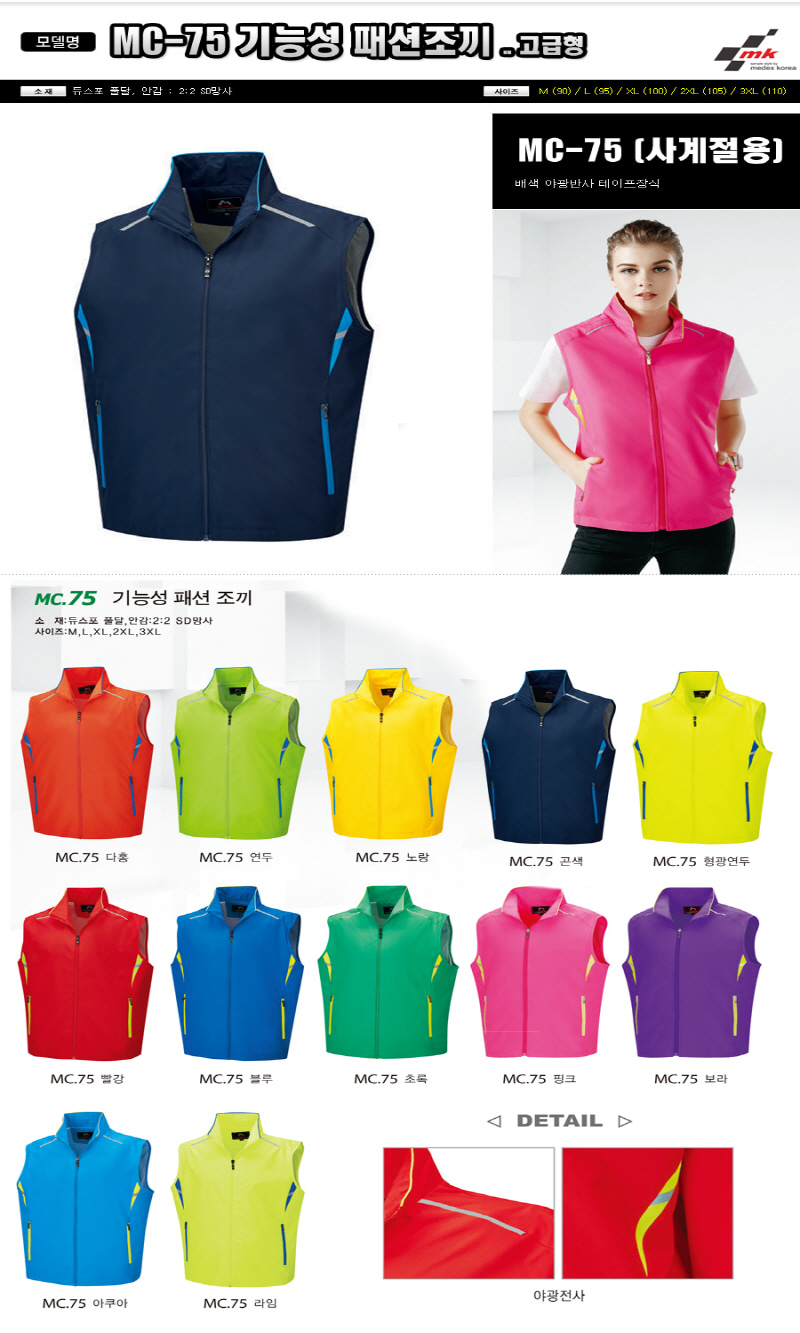 • •Size : M, L, XL, 2XL, 3XL •소재 : 듀스포 풀달, 안감:2:2 SD망사 ※단가변동 있을 수 있습니다. 제품 색상은 인쇄된 것이므로 실제 제품과 다소 차이가 있을 수 있습니다. MC-75
