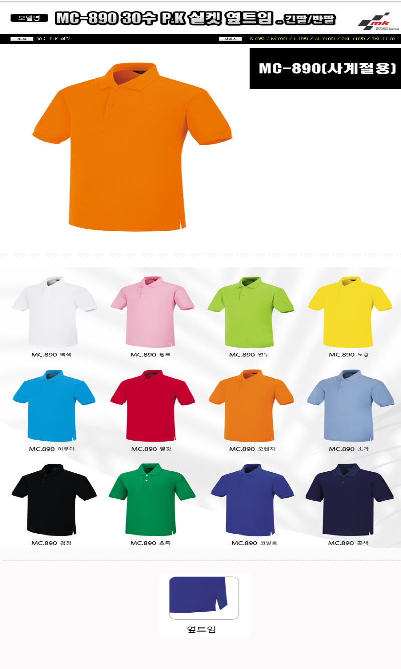 • •Size : S, M, L, XL, 2XL, 3XL •소재 : 30수 P.K 실켓 ※단가변동 있을 수 있습니다. 제품 색상은 인쇄된 것이므로 실제 제품과 다소 차이가 있을 수 있습니다. MC-890