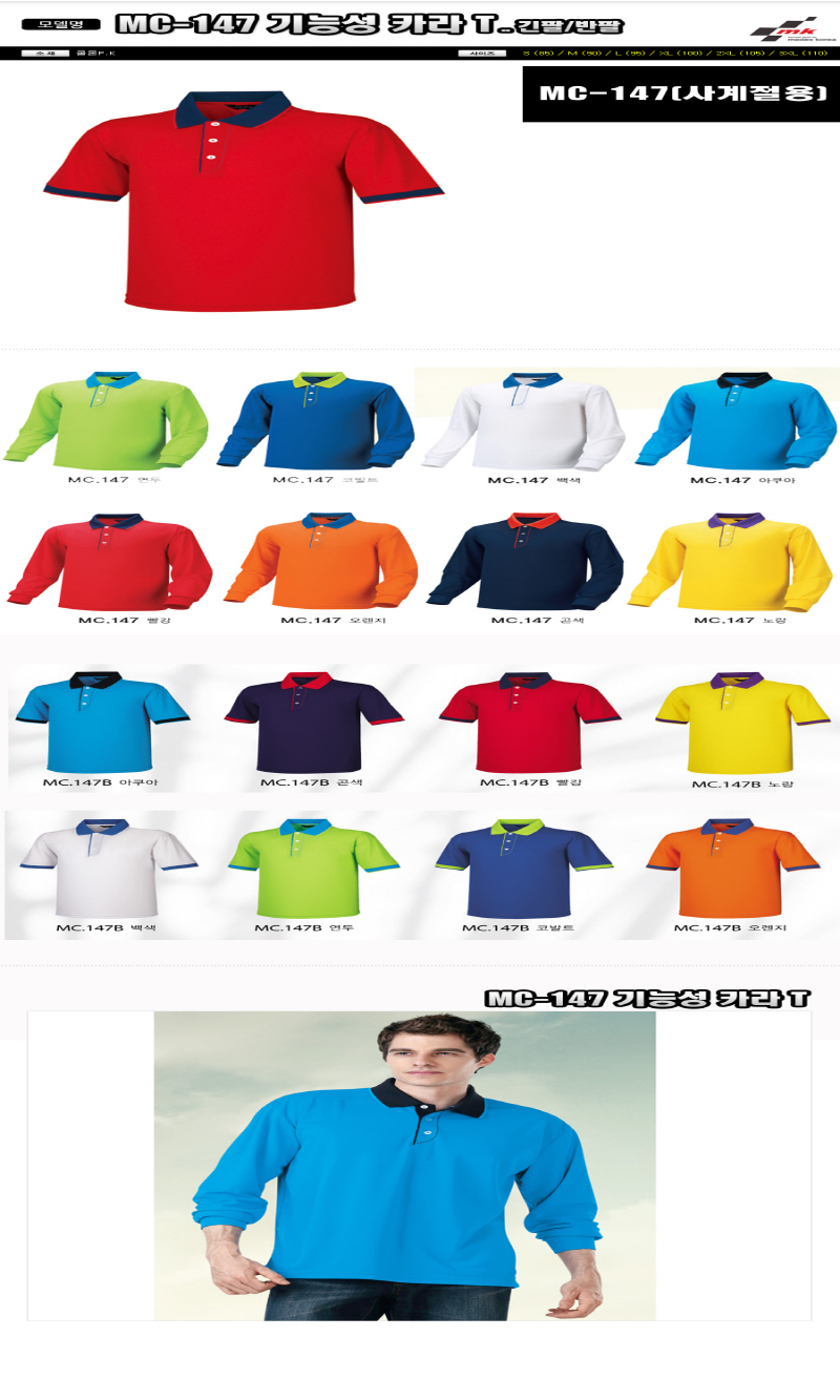 • MC-147 •Size : S, M, L, XL, 2XL, 3XL,4XL •소재 : 쿨로P.K ※단가변동 있을 수 있습니다. 제품 색상은 인쇄된 것이므로 실제 제품과 다소 차이가 있을 수 있습니다.