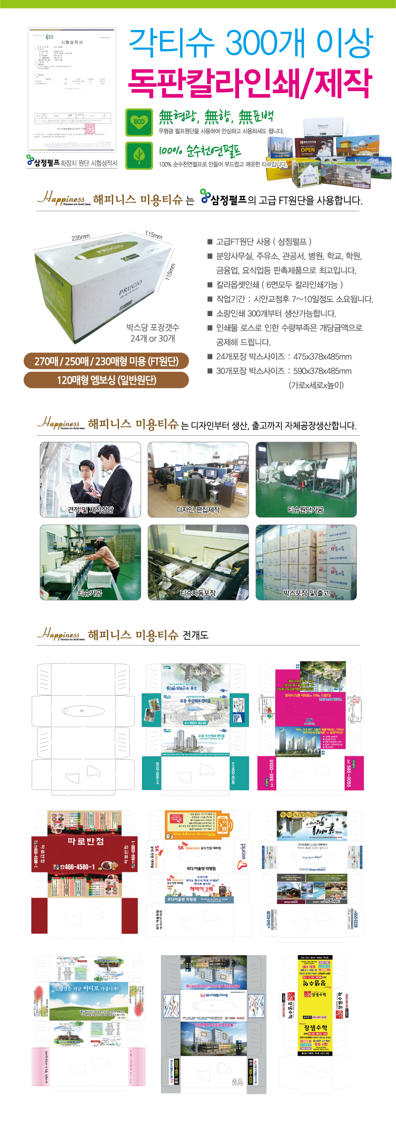 •규 격 : 235 X 115 x 115(120)mm •1BOX당 수량 : 30EA •500개 제작가능 (별도문의) •수량별 가격 별도문의 ※기본 모나리자 원단 사용