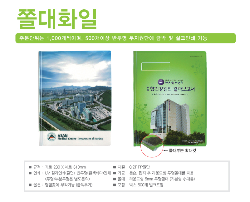 •규 격 : 가로 230x310mm ·인 쇄 : 표지UV칼라인쇄 ·투명 기성품 별도문의