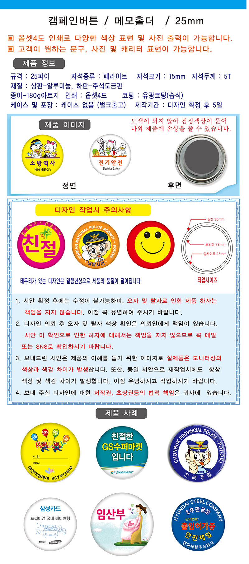 • •1,000EA •기본수량 : 100EA •1,000개 이하 가격 별도 문의 •실사이즈:25mm / 도안선:23mm / 칼선:36mm •실사이즈:32mm / 도안선:30mm / 칼선:45mm 제품 상세 설명 / - 재질 : 철판 / 옵셋인쇄 (유광코팅) - 케이스 및 포장 : 케이스 없음 (벌크출고) - 제작기간 : 디자인 확정 후 5일