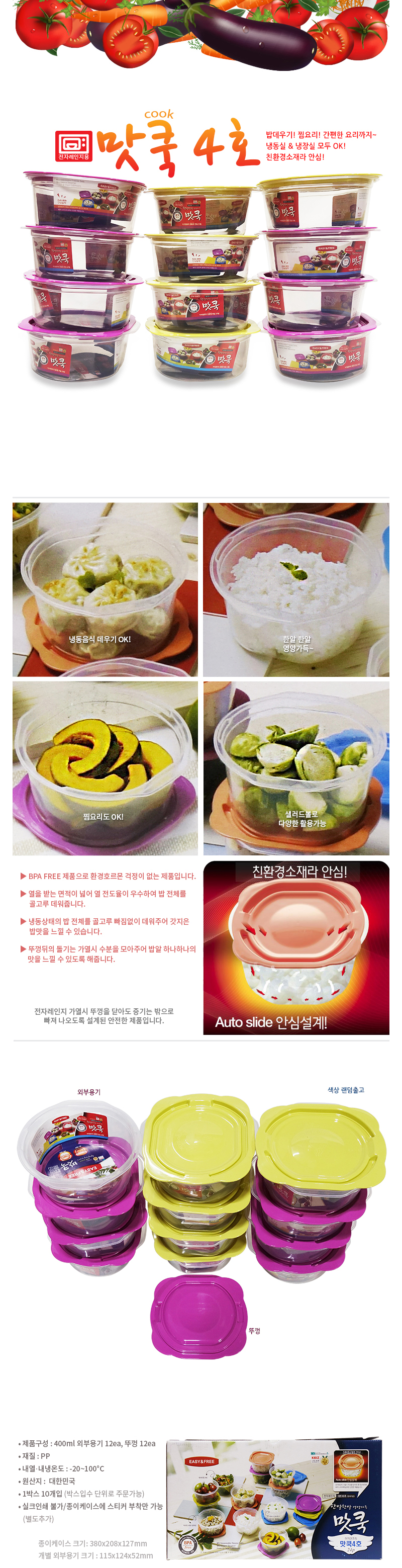 • 구성 : 400ml외부용기*12 • 1Box 10ea입 ※ 전자레인지용 용기제품, 조리도구세트 박스입수 단위로 주문가능 / 인쇄불가 종이케이스위 스티커부착 별도추가