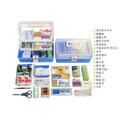 | 기타사항 | 과산화수소수/알콜솜/알콜스틱/멸균가아제/위생장갑/구급상비약 케이스/안대/ 압박붕대/핀셋/탈지면/붕대 중/면봉100p/반창고/밴드/절솜 대/방한대/가위 |